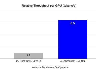 CoreWeave在测试中对比了GB300 NVL72与上一代H100 GPU的性能差异。得益于英伟达对架构的升级以及内存和带宽的增强,GB300芯片展现出了惊人的效率。在仅使用4块GPU的情况下,就完成了原本需要H100芯片16倍数量才能处理的任务,单卡吞吐量提升了整整6倍。